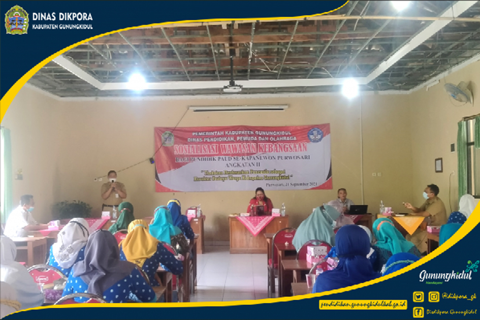 PURWOSARI- Dinas Pendidikan, Pemuda, dan Olahraga (Disdikpora) Kabupaten Gunungkidul menyelengarakan kegitan Sosialisasi Wawasan Kebangsaan Bagi Pendidik PAUD se- Kapanwon Purwosari Angkatan II. Turut hadir dalam kegiatan Endah Subekti Kuntariningsih, S.E. selaku Ketua Dewan Perwakilan Rakyat Daerah (DPRD) Kabupaten Gunungkidul, Drs. Sudya Marsita, M.M. selaku Sekretaris Disdikpora, dan Edar Santoso, S.Sos. selaku Kepala Subbagian Umum Disdikpora Kabupaten Gunungkidul beserta jajaranya. Kegiatan tersebut diikuti oleh pendidik PAUD Non Formal se- Kapanewon Purwosari.